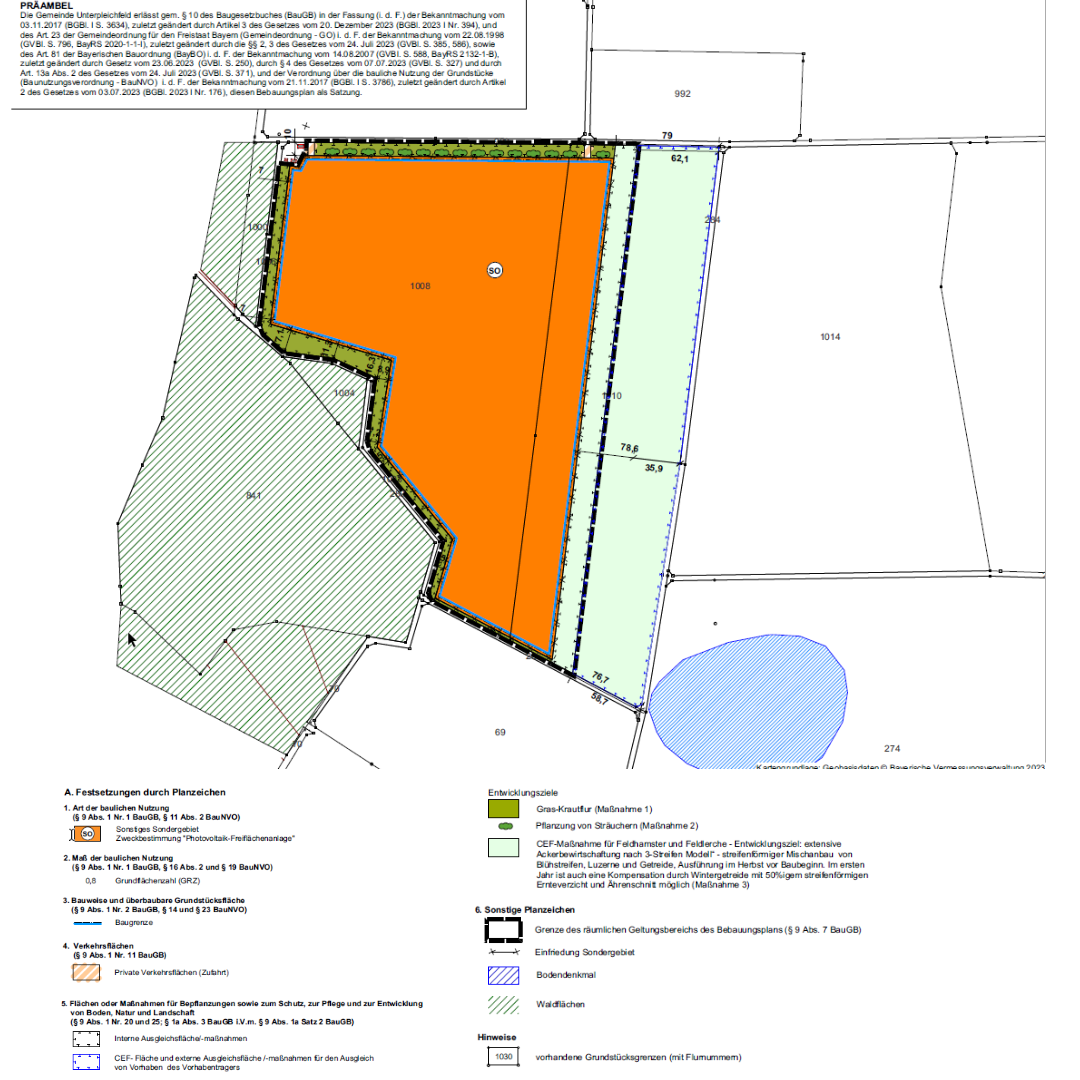 Nordwestlich der Gemeinde Unterpleichfeld im Landkreis Würzburg entsteht im Spätsommer 2025 eine moderne Photovoltaik-Freiflächenanlage: Der Bürgersolarpark Unterpleichfeld-Hilpertshausen erstreckt sich über rund 5,3 Hektar und verfügt über eine Anlagenleistung von 7.200 Kilowatt-Peak (kWp). Mit einem errechneten Jahresertrag von rund 7.471 MWh können damit über 5.700 Personen* mit sauberem Sonnenstrom versorgt werden. Dadurch leistet der Bürgersolarpark einen bedeutenden Beitrag zur nachhaltigen Energieversorgung in der Region Unterpleichfeld. Gehölzstrukturen und Blühstreifen entlang der Anlage verbessern die ökologische Qualität der Fläche, fördern die Artenvielfalt und werten das Landschaftsbild auf.